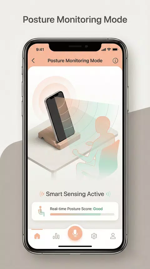 The app uses your phone's accelerometer and gyroscope sensors to detect poor posture like slumping or 'Tech Neck' in real-time. When placed on your desk, it monitors your position and sends instant alerts when you need to correct your posture.